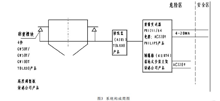如圖3所示,安裝在底部的四個壓式稱重模塊將罐體的重量信號傳至接線盒。接線盒并聯各路稱重模塊信號, 并可根據各稱重模塊受載情況調節角差, 經過匯集后的重量信號送至稱重量變送器。重量變送器將重量信號處理成相應的重量數據傳輸到D C S控制系統。